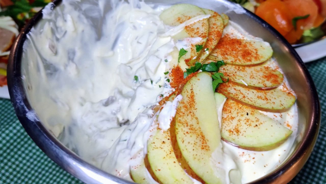 nata fresca e, na apresentação, ganham uma cobertura de finas fatias de maçã,