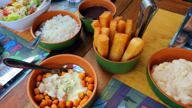 polenta frita, farofa, maionese e nhoque frito ao molho Alfredo. Custa R$ 195 e
