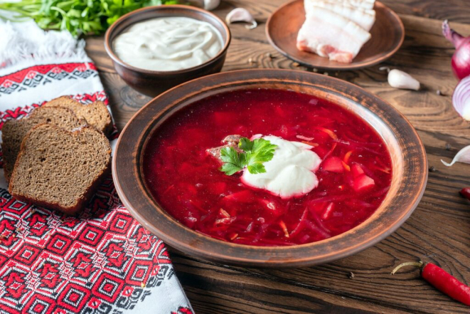 Borscht - Sopa tradicional da Ucrânia, feita de beterraba, defumados e framboesa/nata