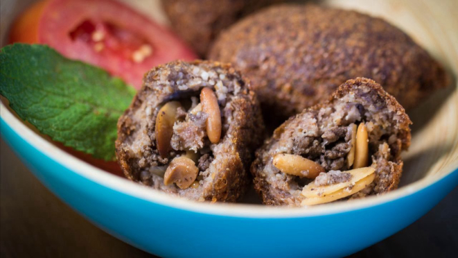 do quibe frito, feito de grão-de-bico e servido com tomate, pepino em conserva,