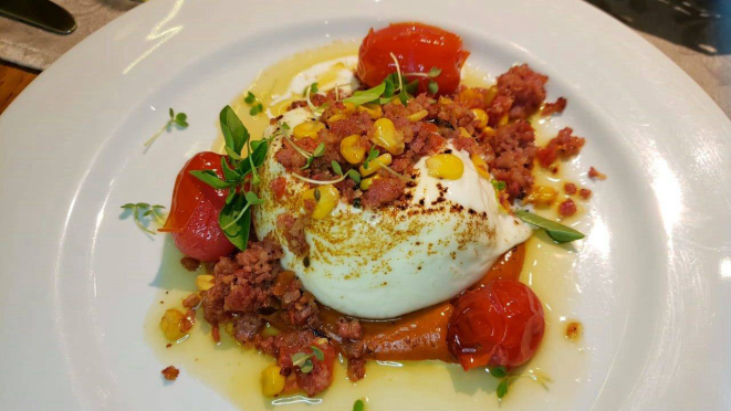 A entrada do menu é uma Burrata de búfala gratinada no forno a