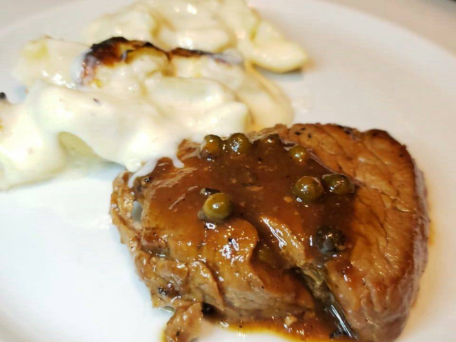 poivre vert, acompanhado por batatas gratinadas ao queijo Gruyère. Não tem