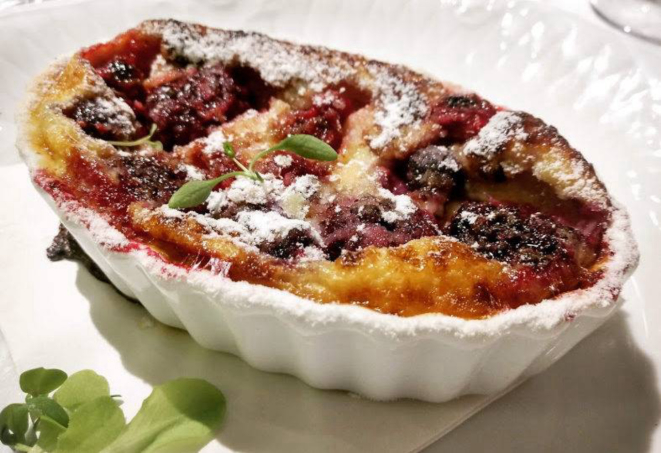 A sobremesa é a Clafoutis de frutas vermelhas, uma sobremesa