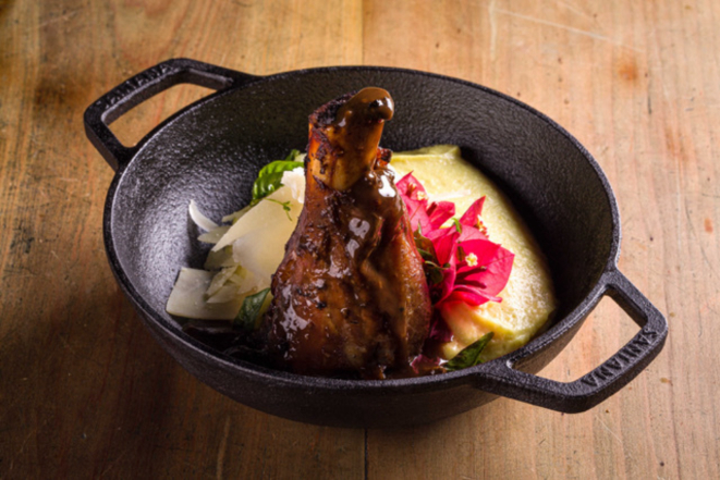 panelinha à mesa. Aberta em seguida, revela, lá dentro, um Ossobuco, feito ao forno 400ºC, gratinado com polenta cremosa,