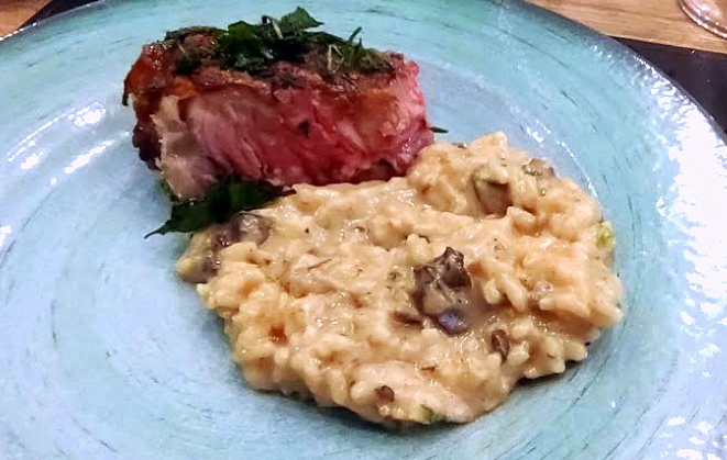 O acompanhamento fica a critério do cliente, a escolher entre Risoto de cogumelo trufado (nossa escolha), Salada de rúcula com tomate fresco, Legumes salteados e Tagliatelle na manteiga.