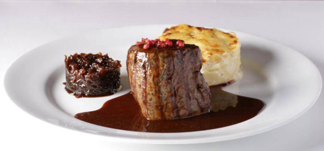 mignon ao molho poivre, confit de cebola e batatas gratinadas, foi