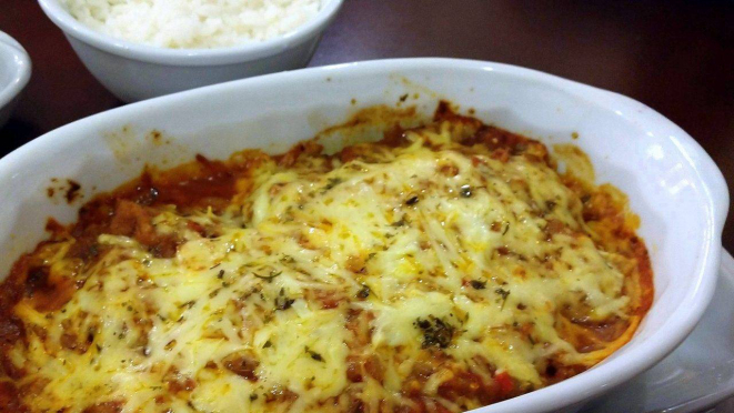 a la Napolitana. A porção bem servida vem com um grande bife à milanesa ao