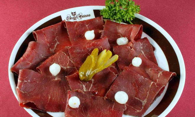 carne seca, típico do cantão de Grisões, na Suíça) e uma sobremesa.