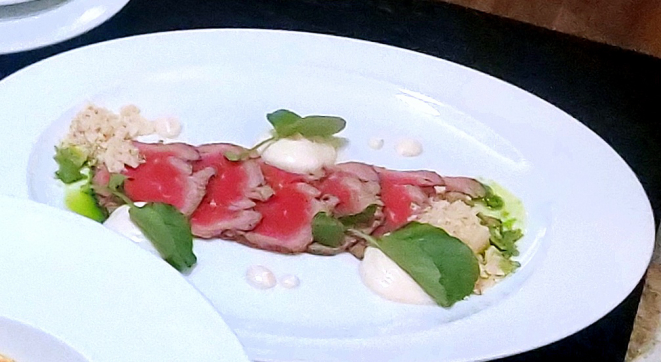 Era ali o detalhe da sutileza das criações de Ronaldo Canha, que se manifesta já no visual do Polvo, nhoque de azeitonas pretas, tomatinhos e pesto de coentro. Claro que o nhoque, negro retinto, chamava a atenção (não perguntei pro chef, mas deduzi que deveria ter um toque de tinta de lula para oferecer cor tão definida, o que as azeitonas somente não poderiam dar – e não ser que ele me explique e desminta). Polvo no ponto perfeito, o detalhe da assinatura do chef estava no nhoque, que só tinha um delicado sabor da azeitona, o suficiente para dar prazer, sem exagero.