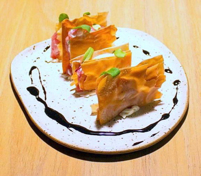 Primeiro, um trio, com Tuna alla Muller, Cesto de cogumelos e Dona