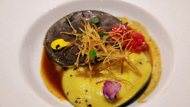 denominado um ravióli de duas faces, uma de massa normal e outra com tinta de