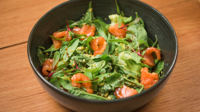 folhas, salmão curado, molho de limão e castanhas. É finalizada com tarê da