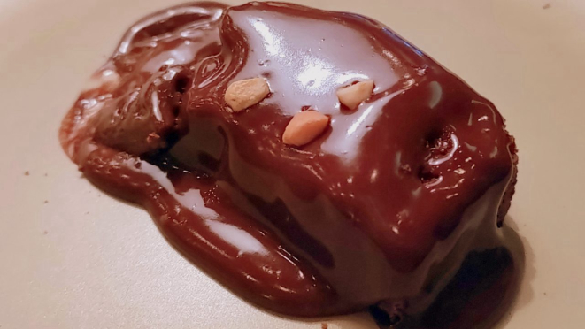 sobremesa. Que, evidentemente, não tem camarões. O Brownie de chocolate com especiarias da Amazônia, calda quente de