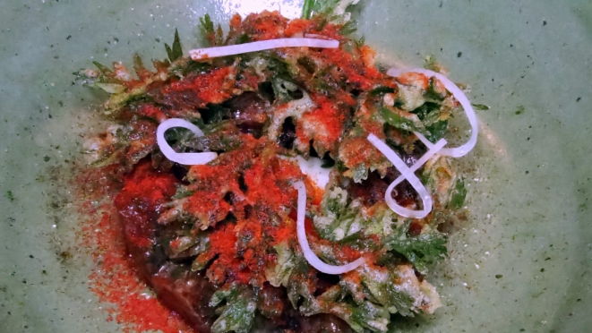 casca de limão siciliano fermentado e um cativante tempura de folha de cenoura.