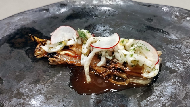 reduzido, crocante de quinoa negra e rabanete. Na harmonização, vinho húngaro,