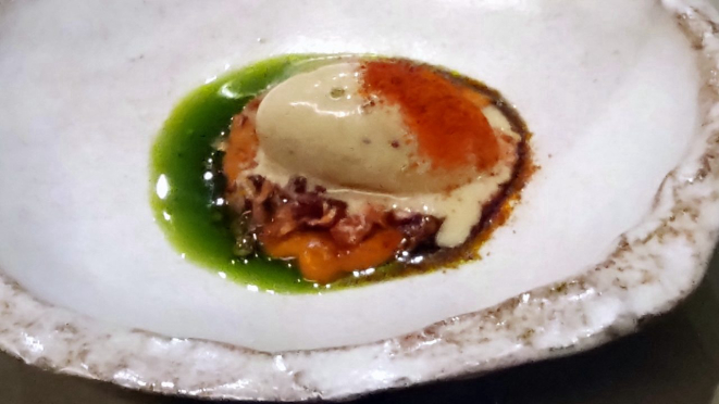 com banha de porco e transformado e creme, com azeite de manjericão, sorbet de