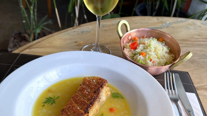 De pratos principais, Filhote em crosta de castanha, tucupi, tapioca