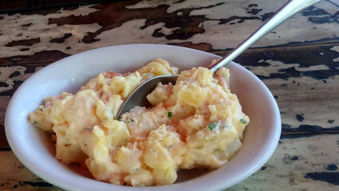 chegando à mesa com uma porção de maionese de camarão, vinagrete de mariscos