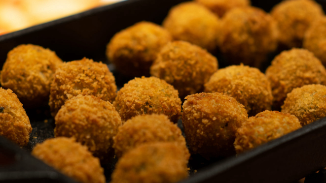 tomate e linguiça, Caponata, Panzanella, e Salada de batata pirulito italiana, mais as frituras, como Polenta frita, Arancini e Frango crocante