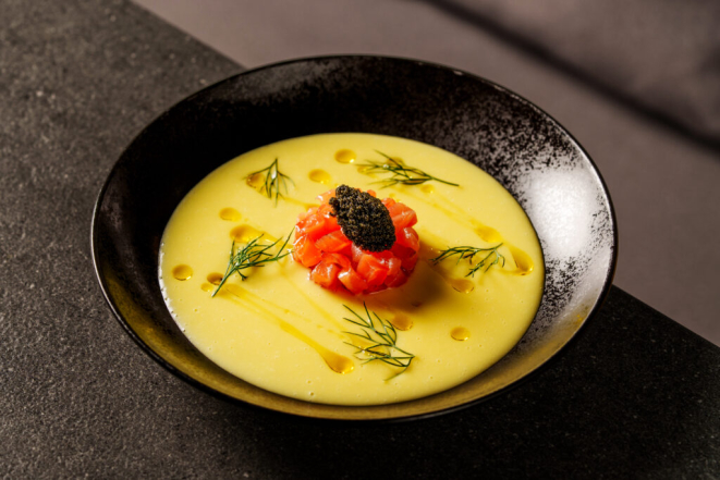 Tudo começou com o Creme de batata-salsa com tartar de salmão defumado, dill e ovas de tobiko (R$ 118). Cabem aqui algumas observações: batata-salsa foi por minha conta (estava mandioquinha), pois, afinal, é como conhecemos por aqui o que os paulistas (como Miyake) chamam de mandioquinha e os cariocas de batata-baroa. Mas, como estamos em Curitiba...
