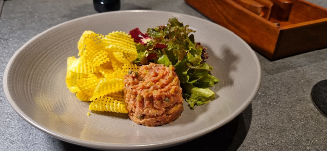 Vieram as entradas. Primeiro, Steak tartare de mignon angus com chips de