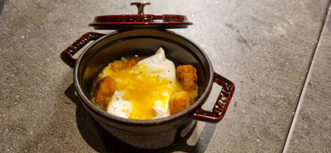 (R$ 56) – ovo poché ao molho de vinho tinto, com bacon, champignons, ervilhas