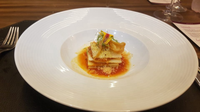 A Lasanha de palmito pupunha com moqueca de siri, que veio a seguir,