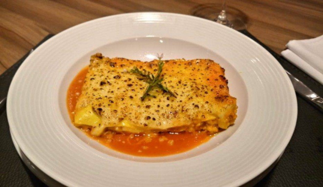 italiana 00 recheada com ragú de carnes suína e bovina ao molho bechamel, gratinada
