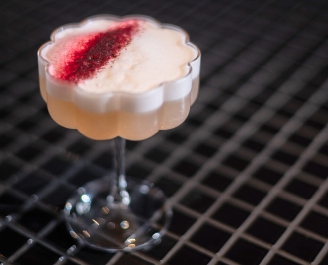 (Gin Miden zero álcool, xarope de açúcar, limão, albumina. É cítrico, adocicado, aveludado)