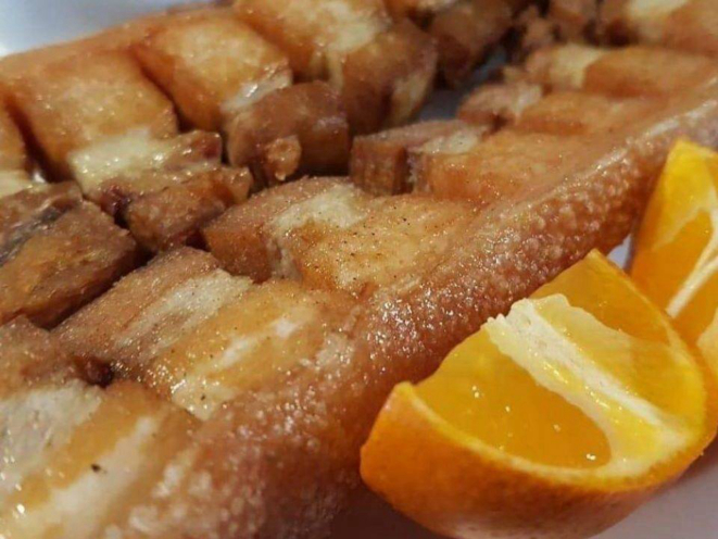 barriga de porco (pancetta) grelhada, que chega à mesa crocante que ela só,