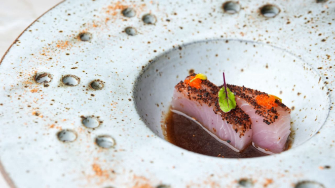 O primeiro prato será o Peixe branco com crosta de soja fermentada,