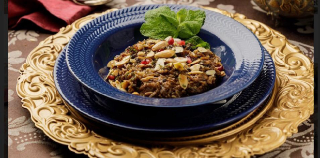 hortelã e especiarias árabes, finalizado com tâmaras e amêndoas douradas na