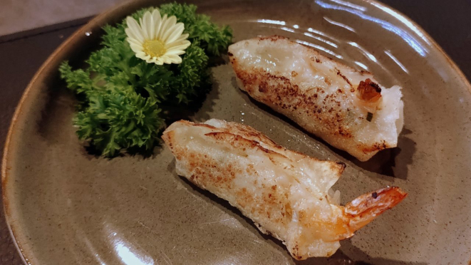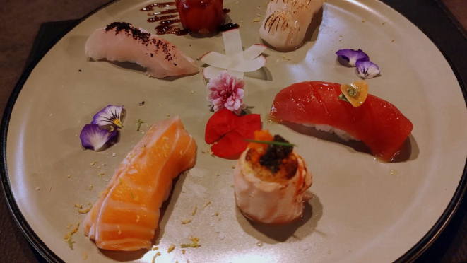 vieira maçaricada com azeite de trufas, Niguiri