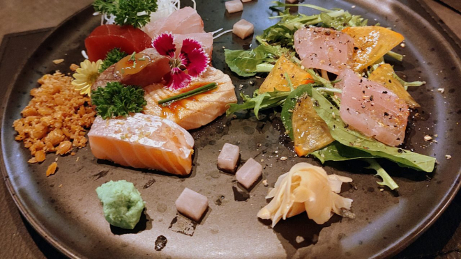 dos sashimis, com as três variedades de peixes acompanhadas de lascas de caqui,