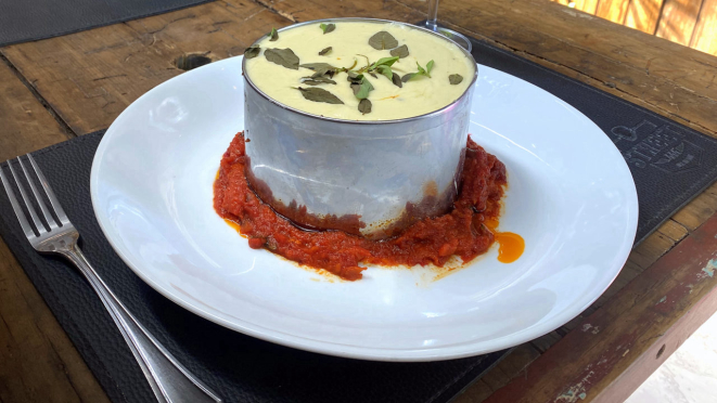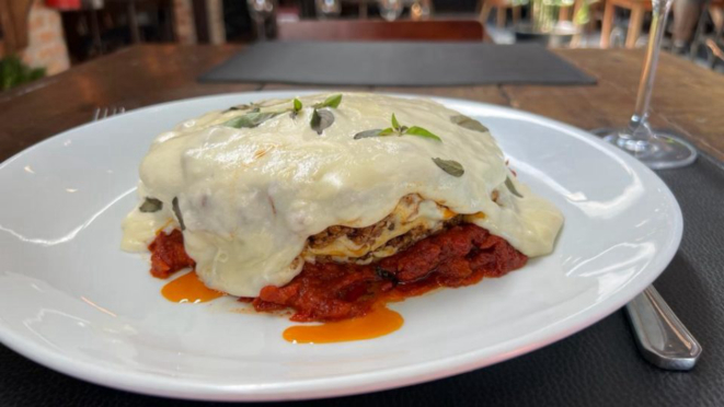 Lasanha Vesúvio, que escorre lavas pelo prato e é muito saborosa