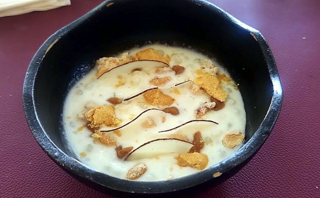 Para sobremesa, a escolher entre Mousse de chocolate com caramelo salgado e Sagu de coco com amendoim. Elegi o sagu – não sou muito chocolateiro -, que me pareceu remeter a um sabor conhecido, de casa. Sim, canjica, daquelas completas (baiana, como chamam), com coco e amendoim. Foi quando o Lenin me lembrou tratar-se de uma sobremesa que ele fazia nos primeiros tempos do C La Vie, que um cliente lembrou e ele foi resgatar. Feliz resgate, recompensador.