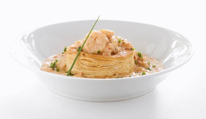 Valdoeiro Chardonnay 2017, foi o escolhido para acompanhar a entrada, o Vol-au-Vent de pescada amarela e camarões,