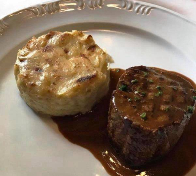 molho Roquefort, com maçã caramelizada e batatas gratinadas.