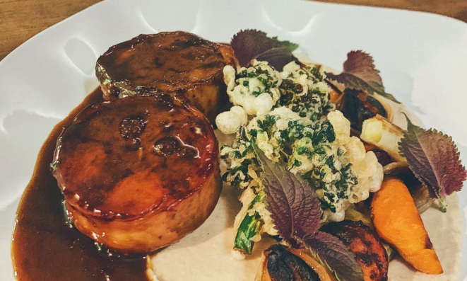acompanhado purê de pupunha, legumes tostados e tempurá de cenoura e custa R$