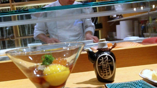aqueles aficionados à criatividade dos sushimen, frente a frente no balcão, à