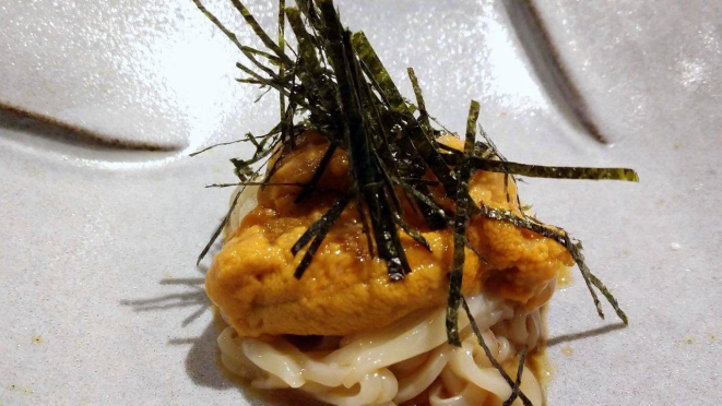 finas fatias de lula, cobertas com ouriço, temperadas com shoyu, limão, wasabi