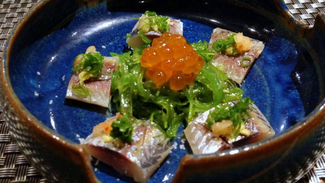 cinco entradas, sushi Aizu, sushi de atum com foie gras, dois pratos quentes e