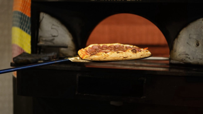 pizzas lá produzidas e servidas.