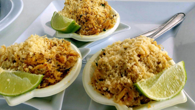 três queijos - (R$ 52 a dúzia) extraídas dali mesmo, da própria baía. O Camarão à milanesa utiliza o camarão