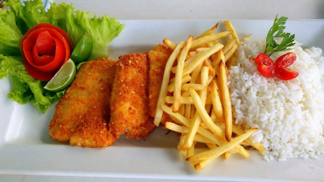 já poderia ser sozinho o prato principal) e fritas. Mas ainda tem salmão,