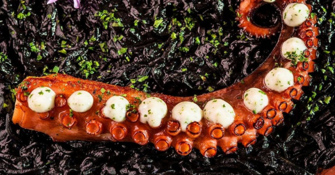 vinagrete e azeite de carvão, que deixa o visual final de um arroz negro.