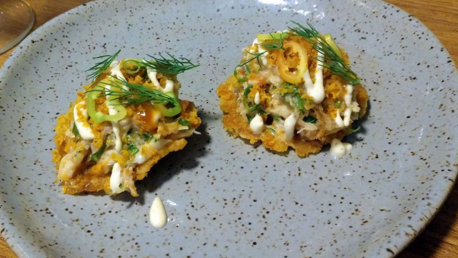 com carne de siri, vinagrete e maionese da casa, finalizado com tucupi, bottarga