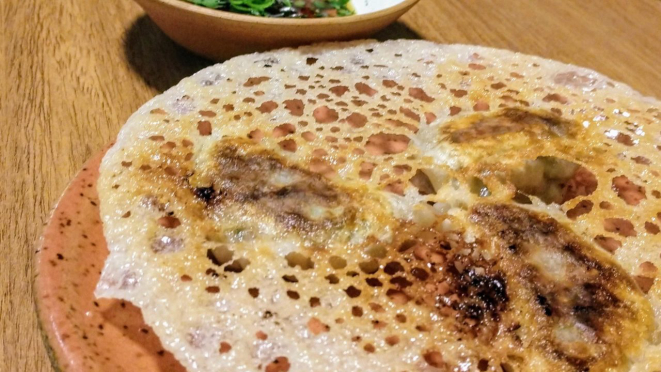 A sobremesa foi Mani Matchá, um bolo de mandioca (mani) fermentada