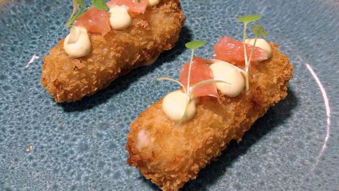 um croquete de vegano de palmito pupunha, finalizado com laranja fresca,