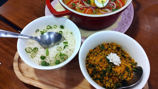 acompanhamento, Farofa com migas de broa, couve e feijão fradinho e ainda Arroz